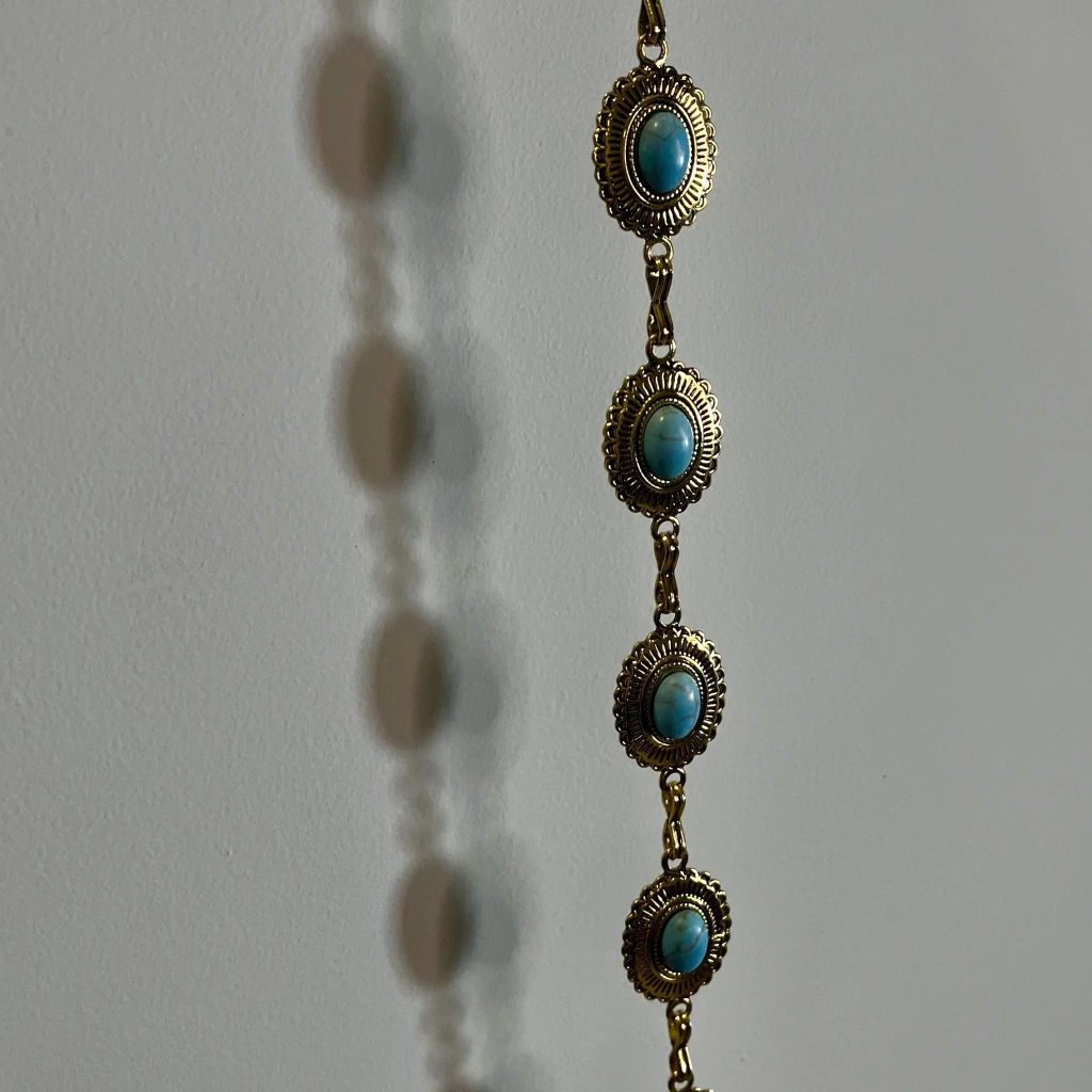 O Cinto Alma Turquesa é a materialização da conexão com a natureza e do espírito aventureiroem um acessório de destaque. Seu estilo autêntico é elevado pelos elos robustos em metal dourado envelhecido que se intercalam com perfeição, unindo a força do design rústico com a beleza celestial da pedra turquesa.