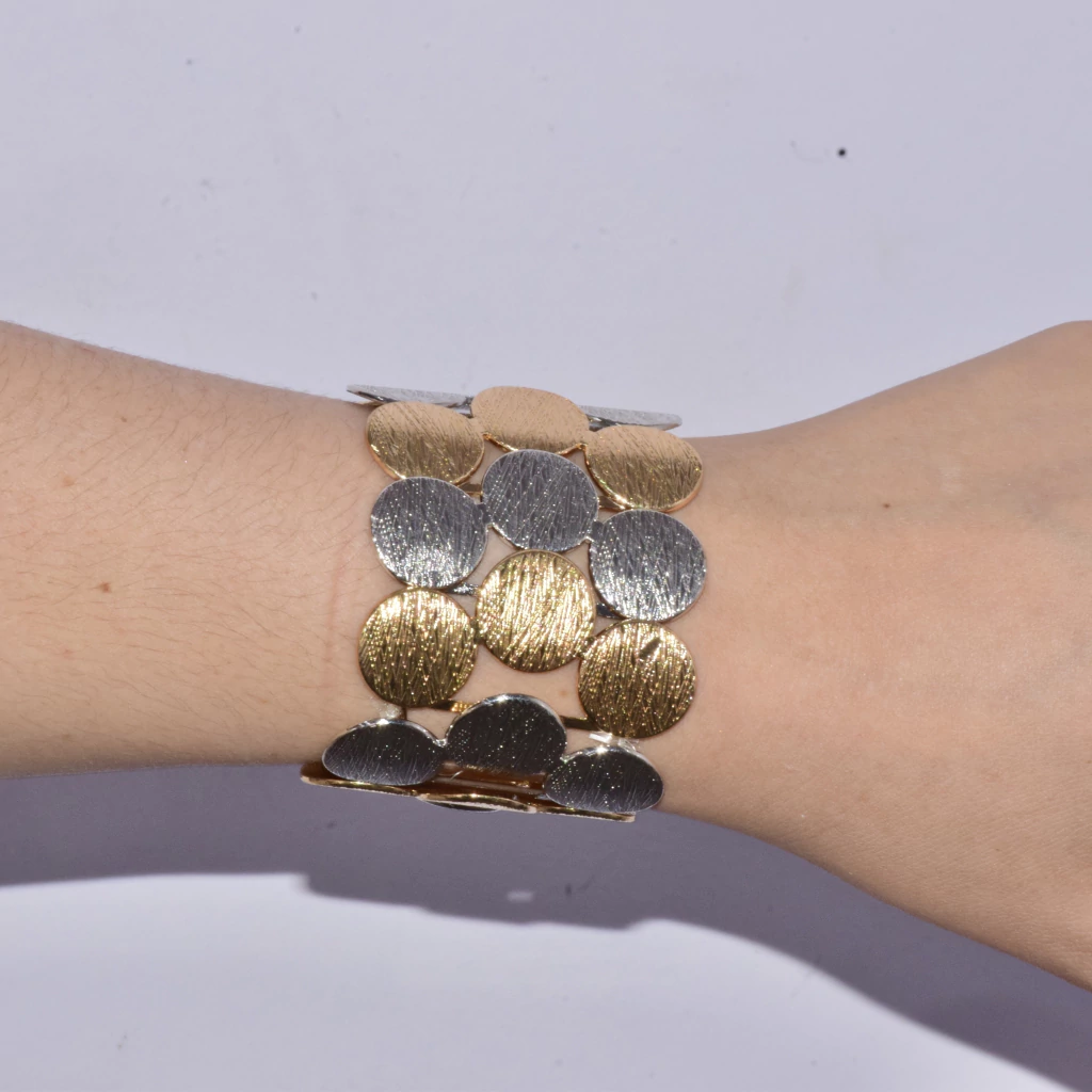 A Pulseira Cernon combina o brilho do dourado com a elegância do prateado em um design geométrico e contemporâneo. As plaquinhas texturizadas criam um jogo de luz sutil, que valoriza qualquer produção — do look de trabalho ao visual noturno.